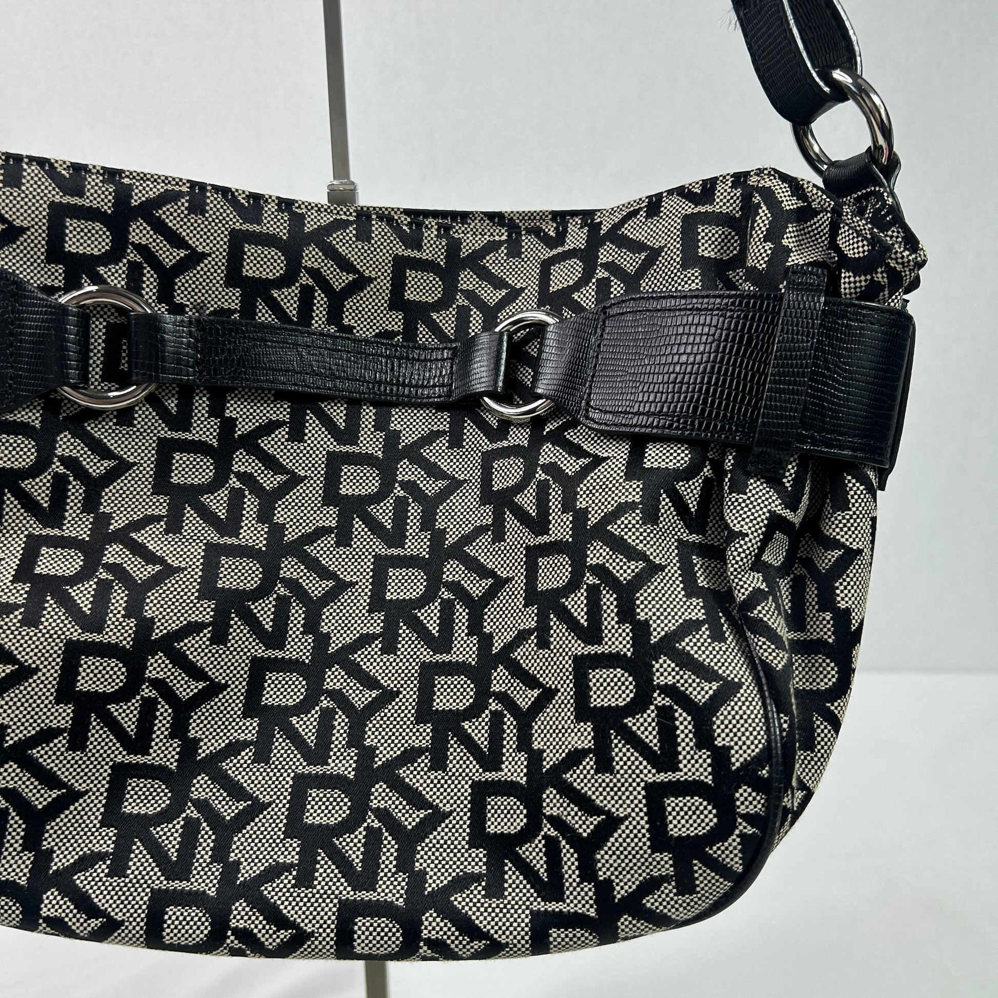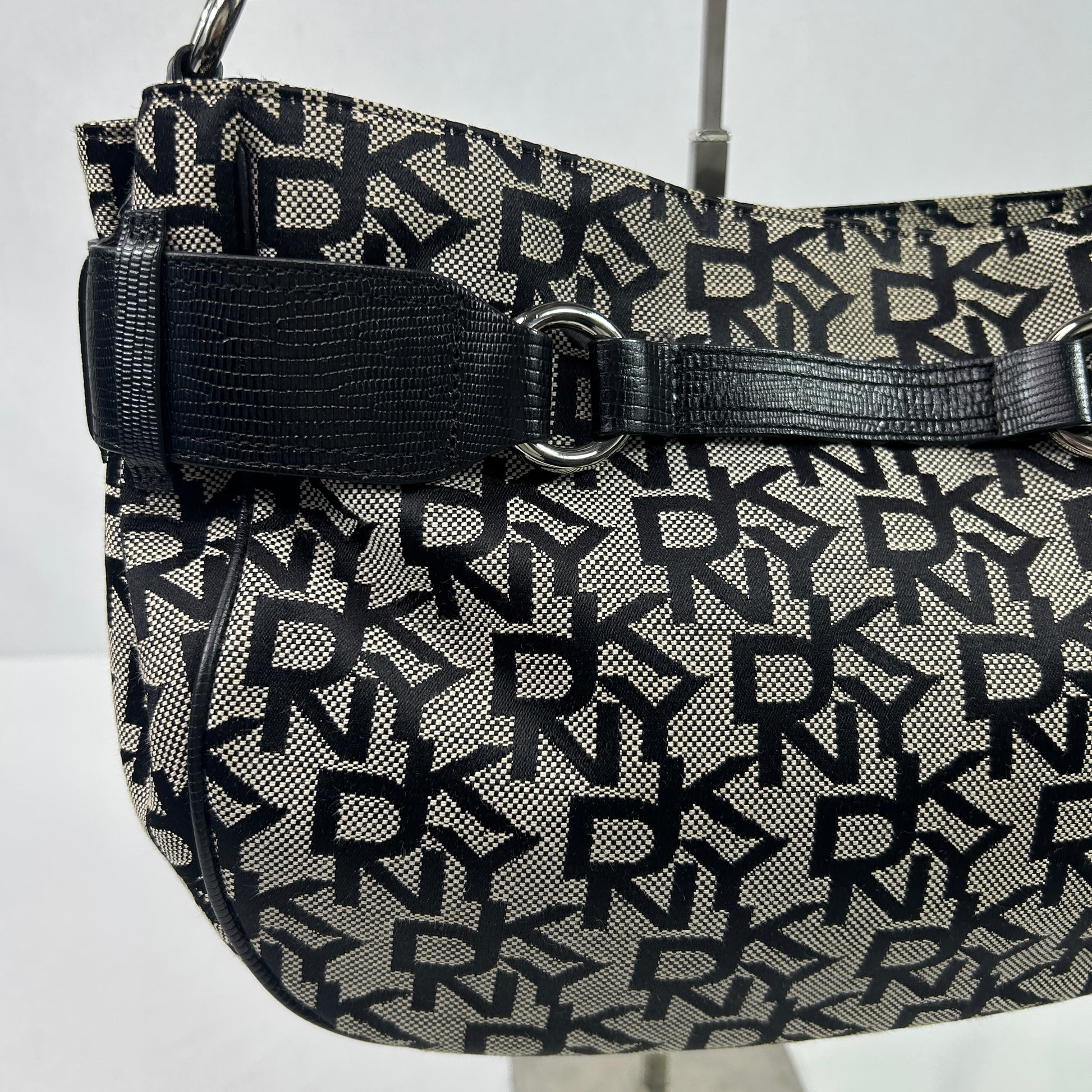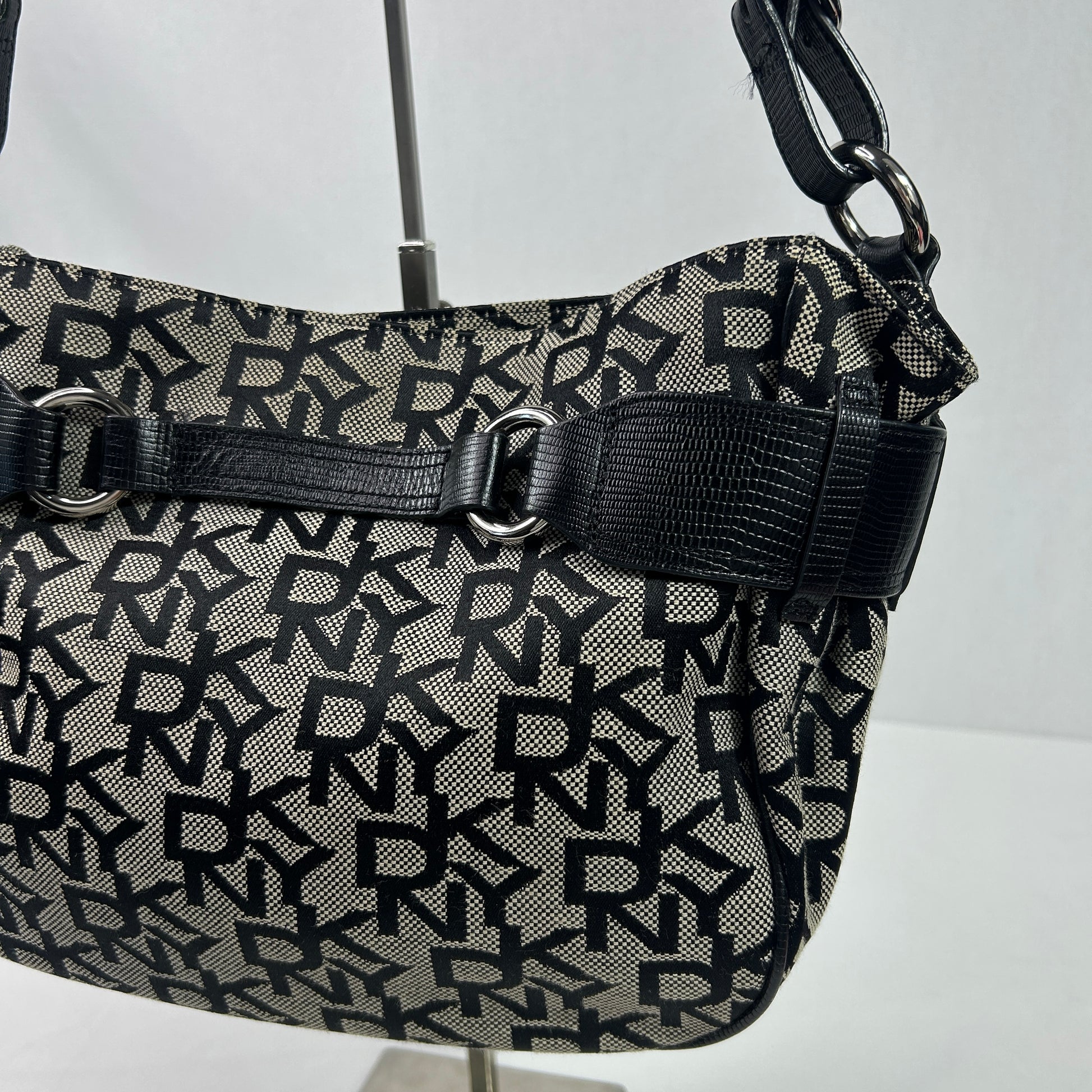Super cute rectangular DKNY monogram shoulder bag with silver hardware. In perfect condition. I would consider this bag a medium size. Perfect everyday bag, will fit quite a lot for essential things. Please advise their is a small stain inside the bag.