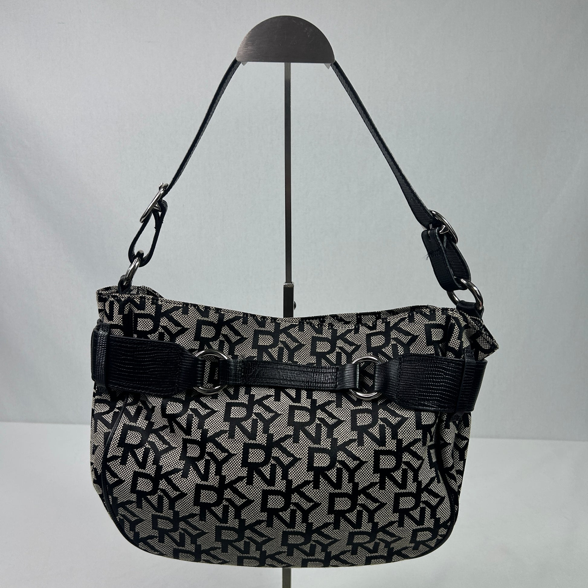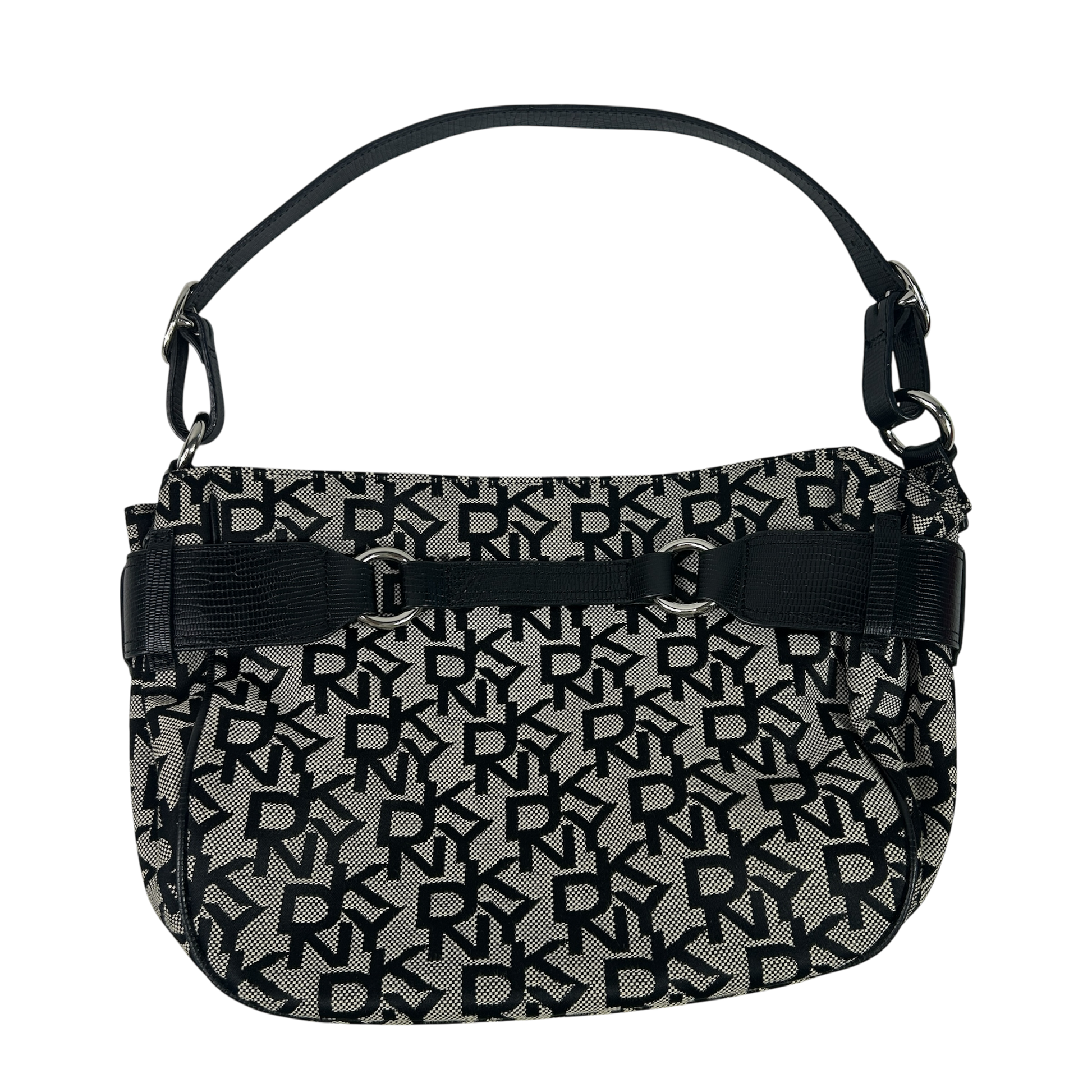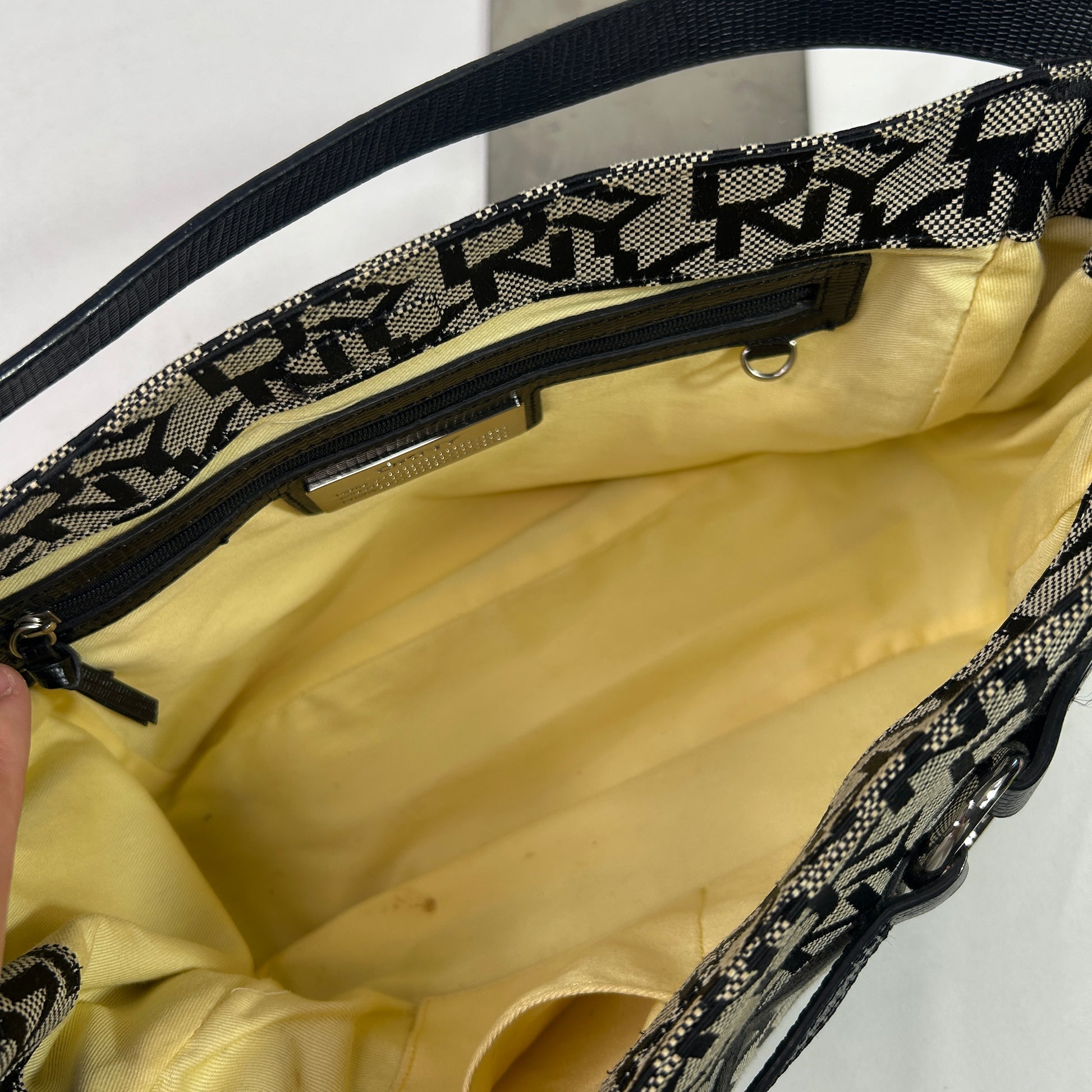 Super cute rectangular DKNY monogram shoulder bag with silver hardware. In perfect condition. I would consider this bag a medium size. Perfect everyday bag, will fit quite a lot for essential things. Please advise their is a small stain inside the bag.