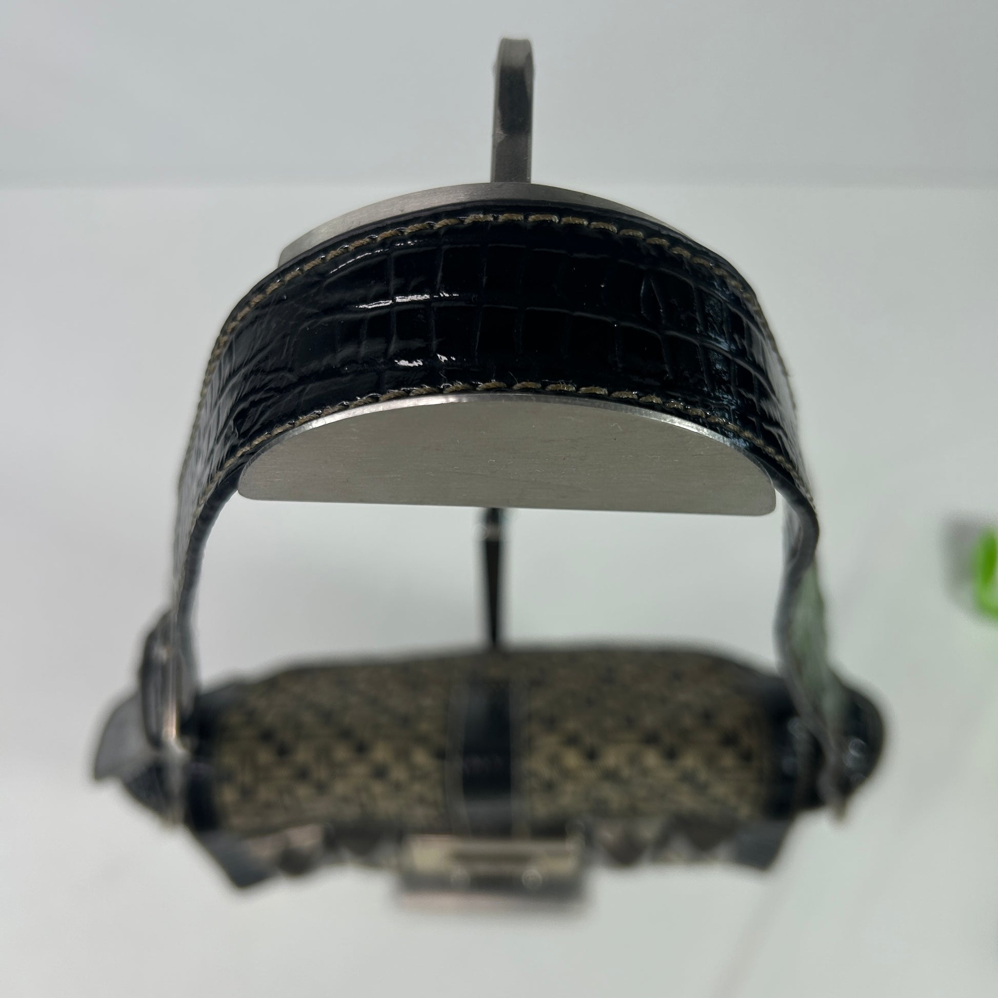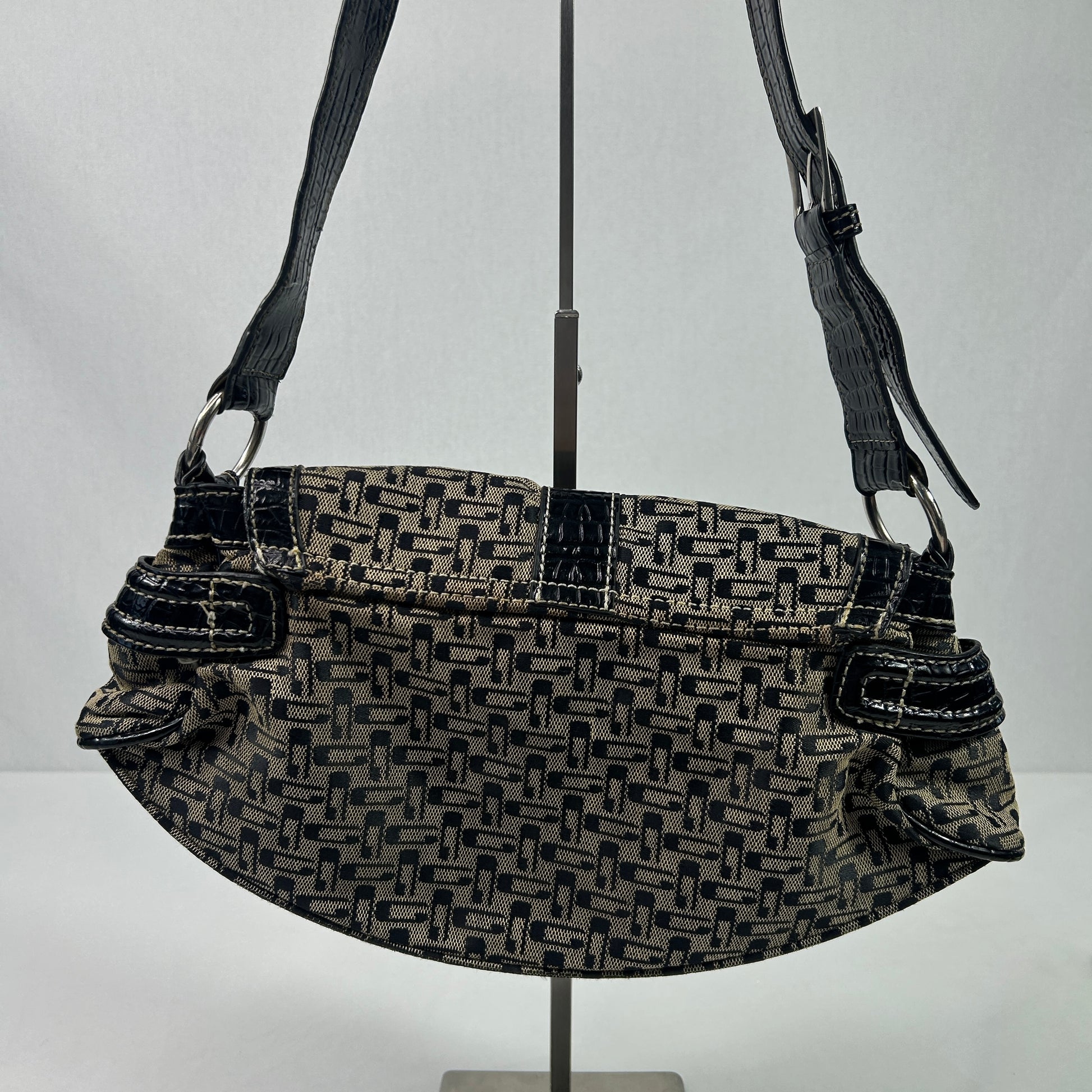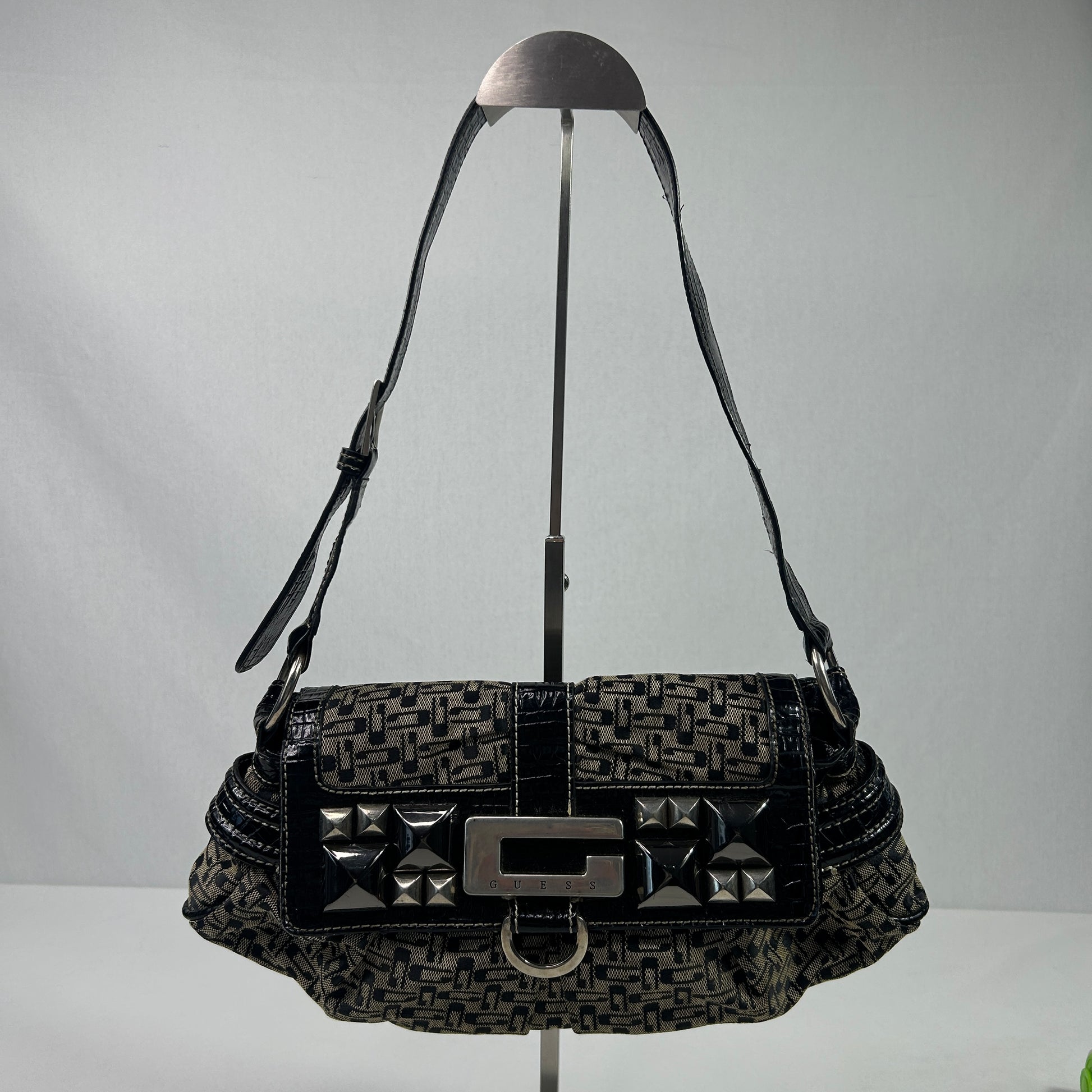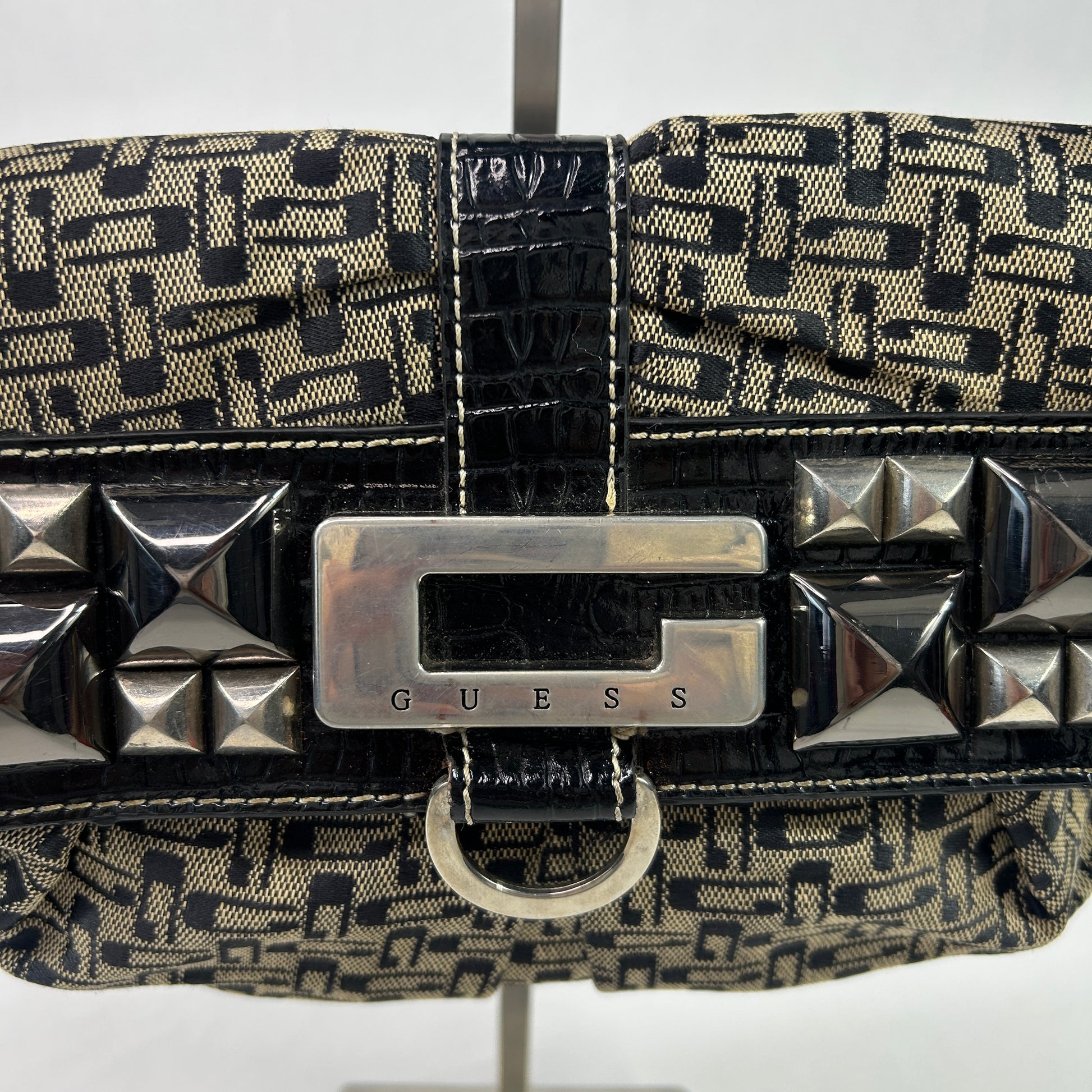 Monogram G Guess shoulder bag with silver hardware. Black patent leather panels & pyramid studs. Magnetic clasp. Signs of usage but overall great condition.