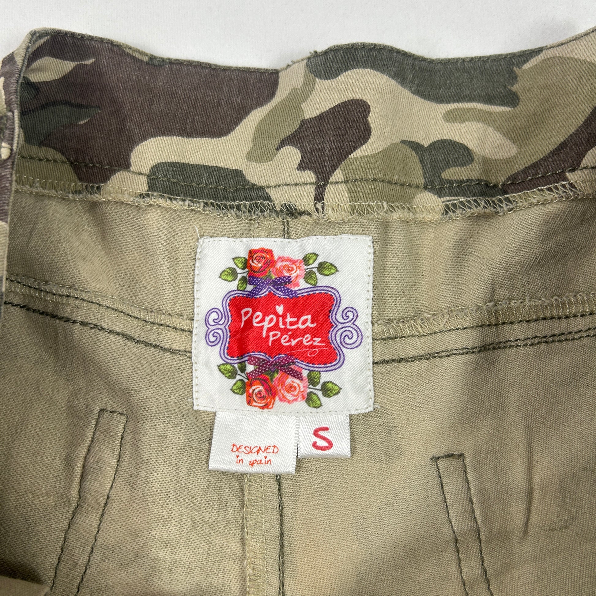 Green low rise camo cargo shorts.Please advise model is wearing it pinned back on her.