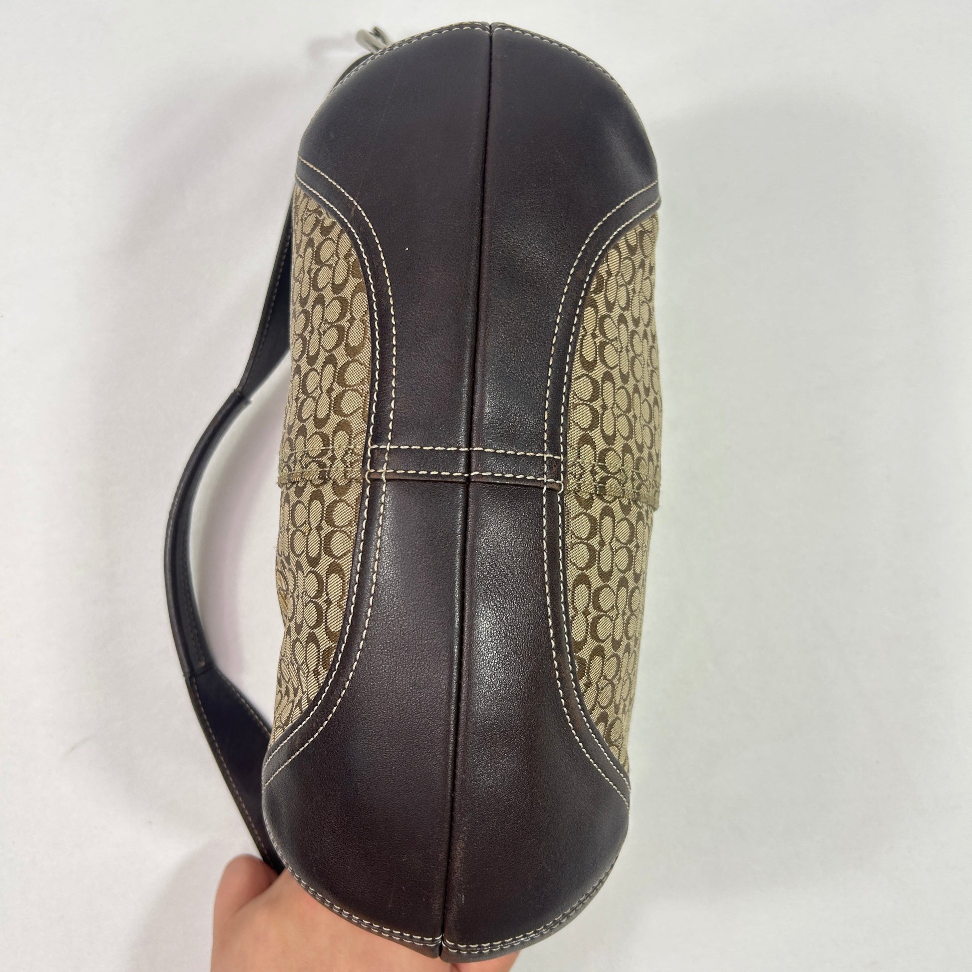 Brown coach hobo shoulder bag with silver hardware. Secure zip closure opens to a satin-lined interior. Right amount of space for your essentials. Strap is slightly adjustable as well.