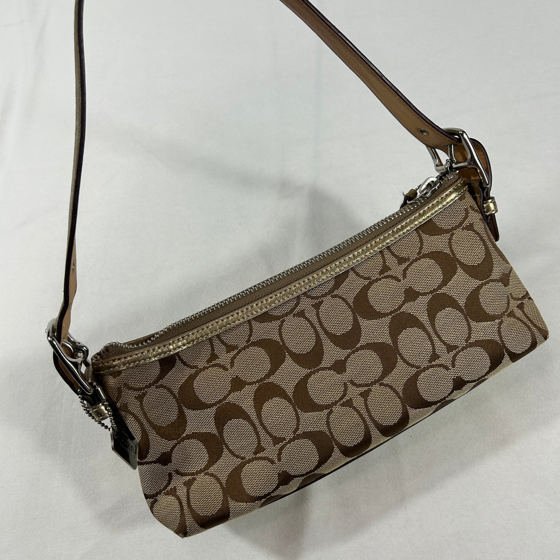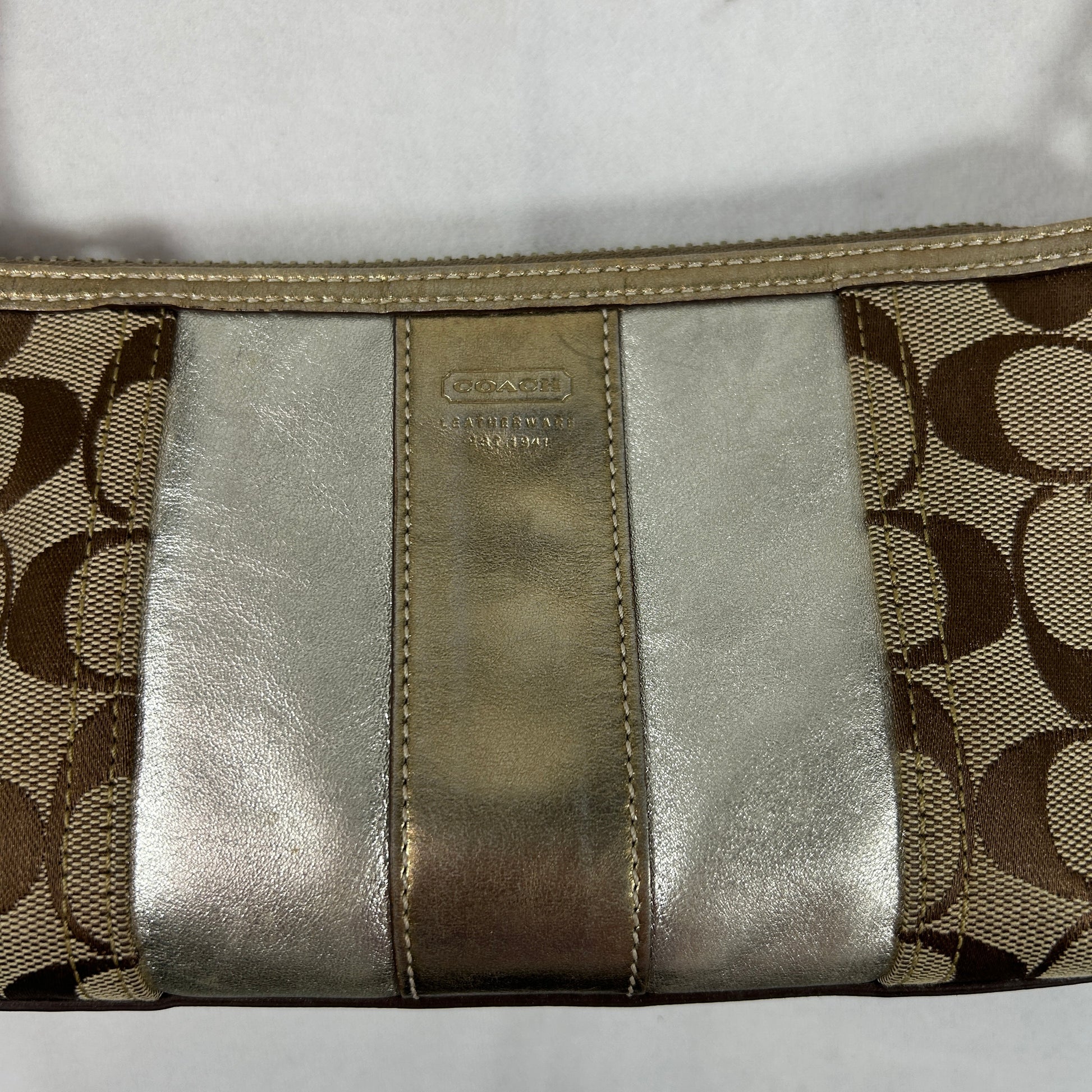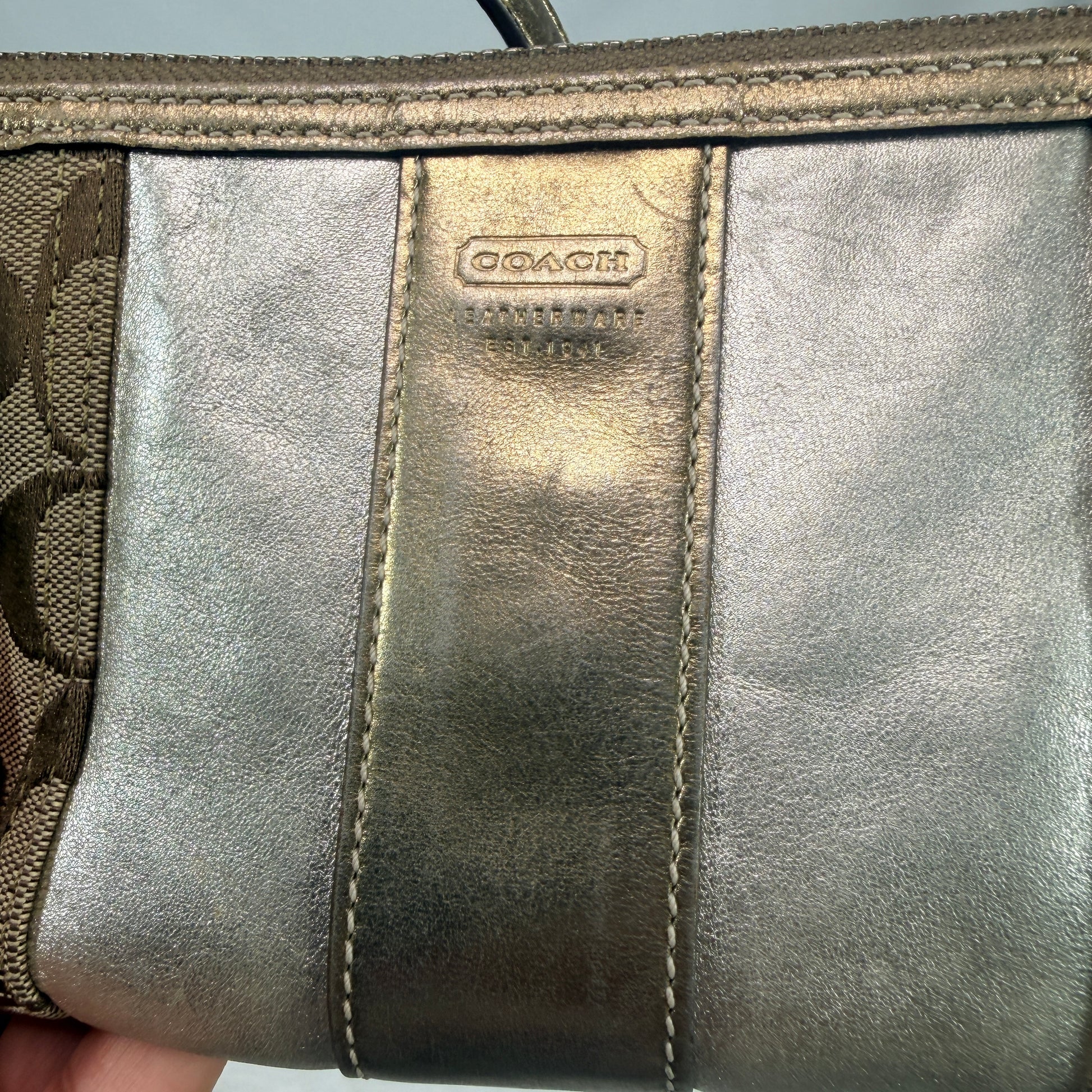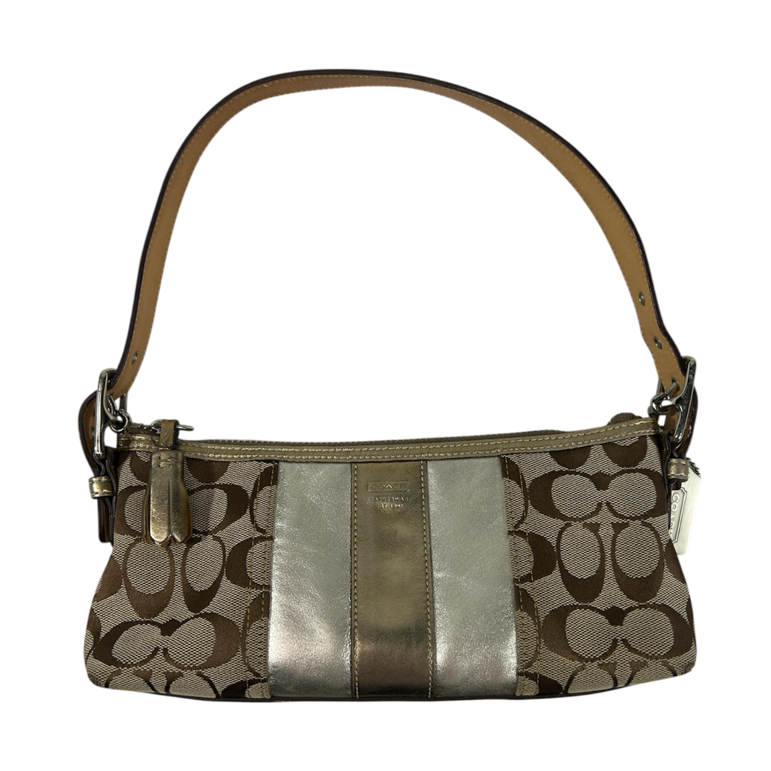 Classic Coach small shoulder bag with a wide metallic gold leather panel runs vertically down the front with silver hardware