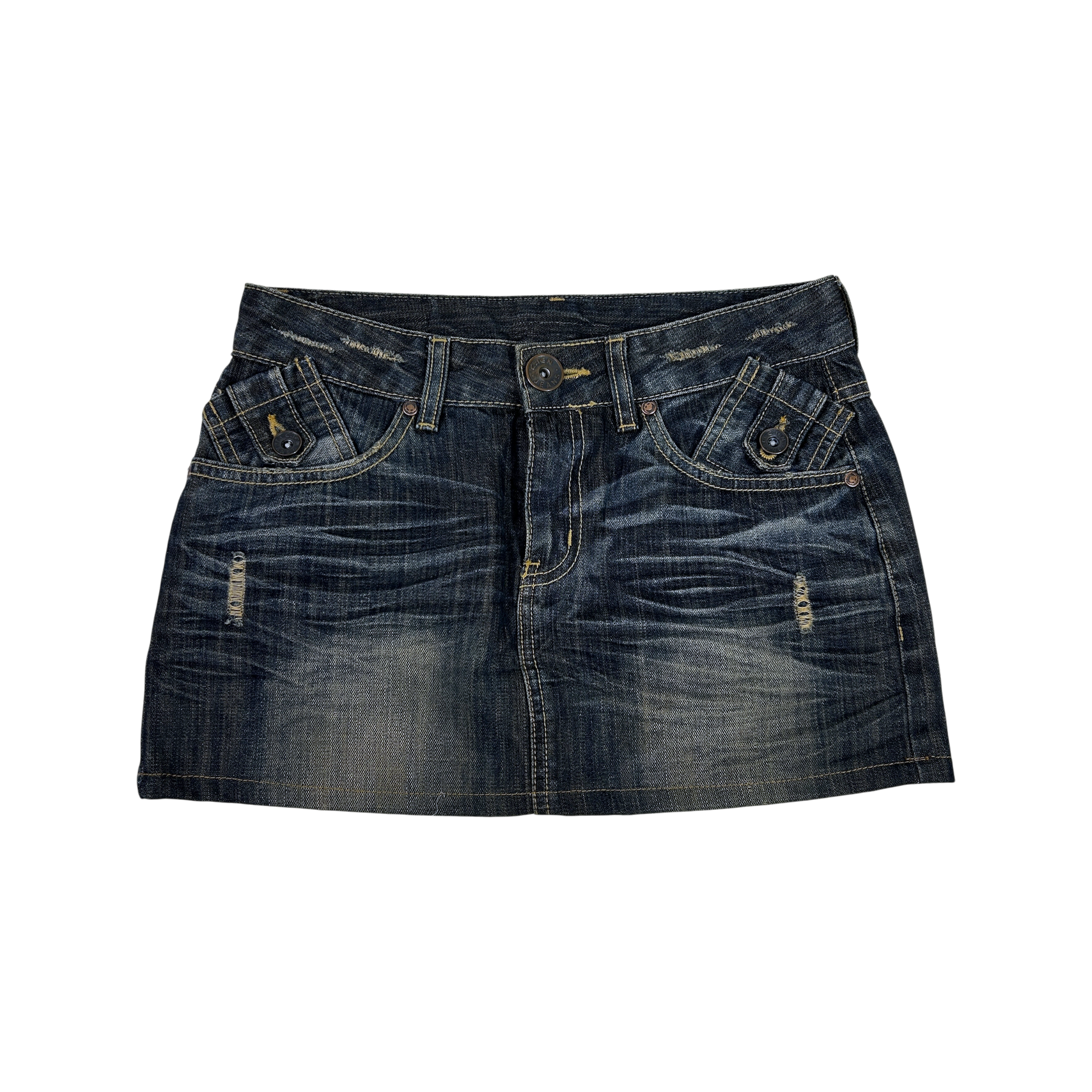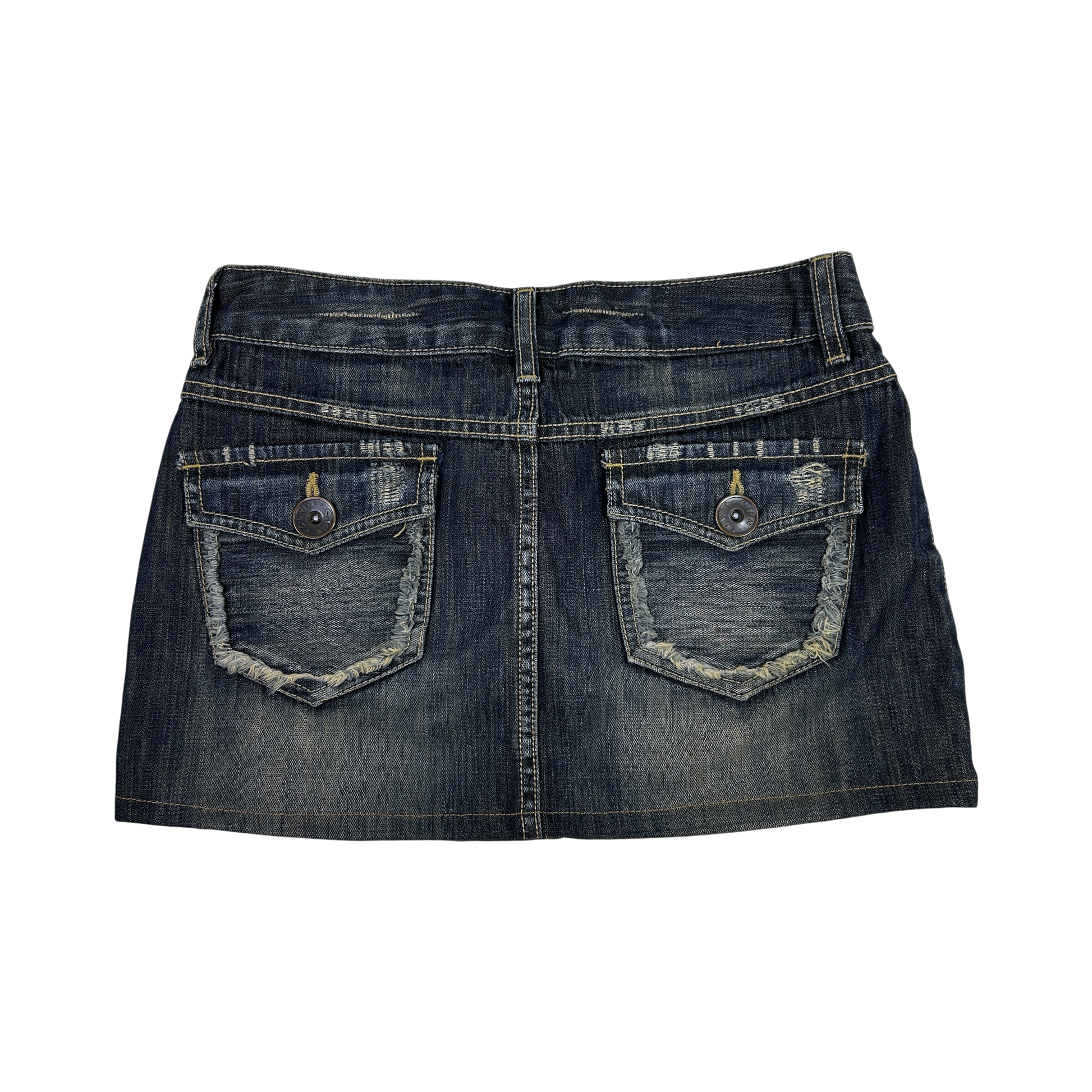 Insane dark wash denim skirt with super cute detailed back pocket.
