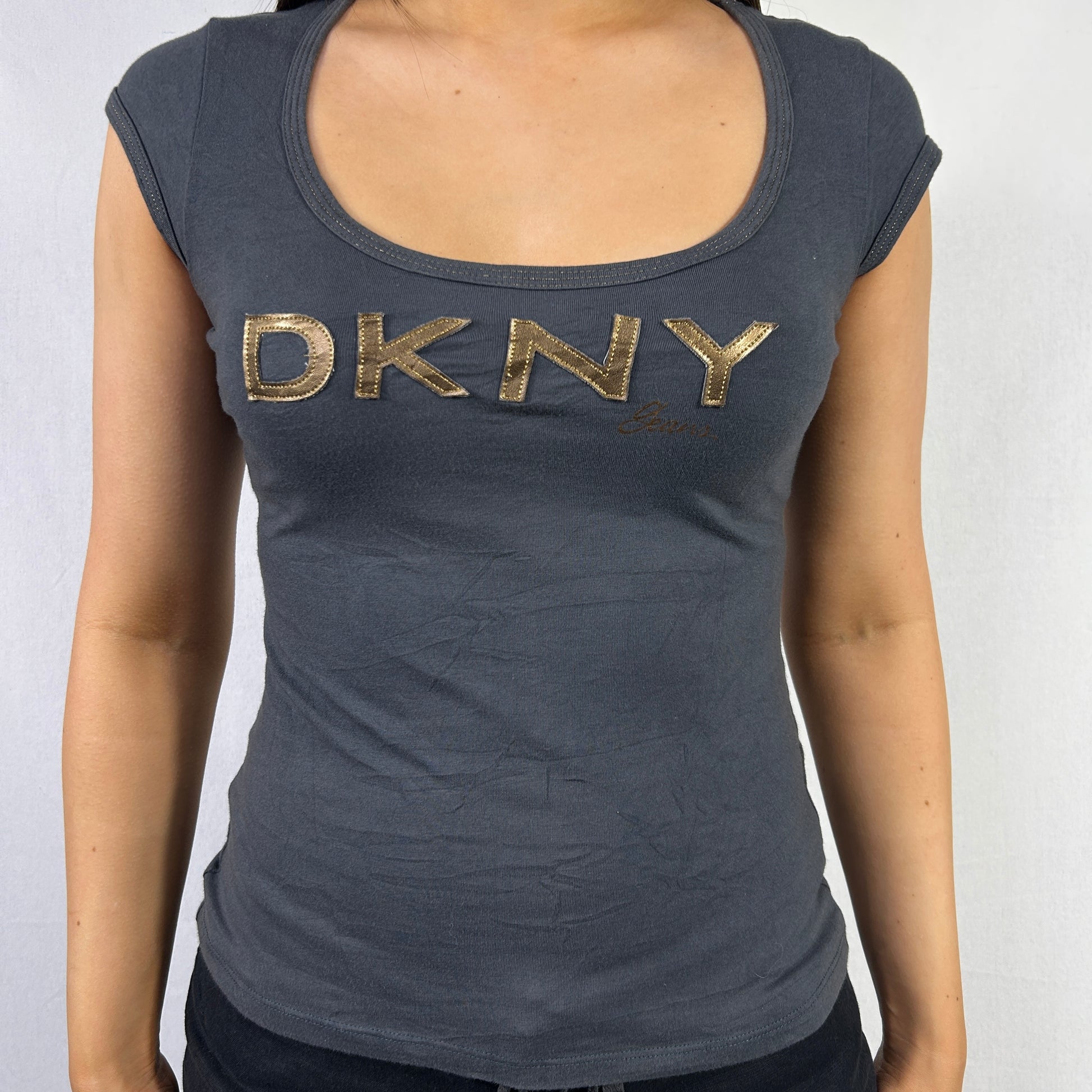 Grey leather detail DKNY Jeans babytee. Super stretchy material. Faux leather patches.