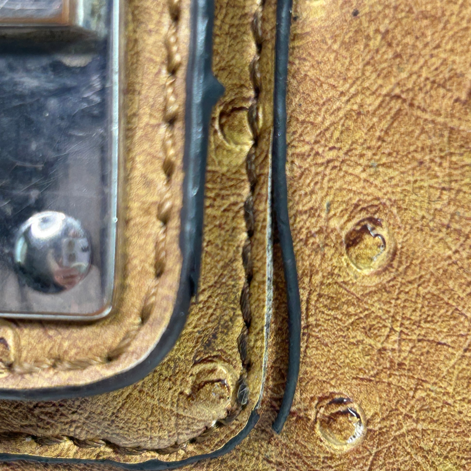 Please refer to photos. Front of the bag, the black lining is coming off a tad bit but can be fixed. The shoulder strap is also a tad worn as well.