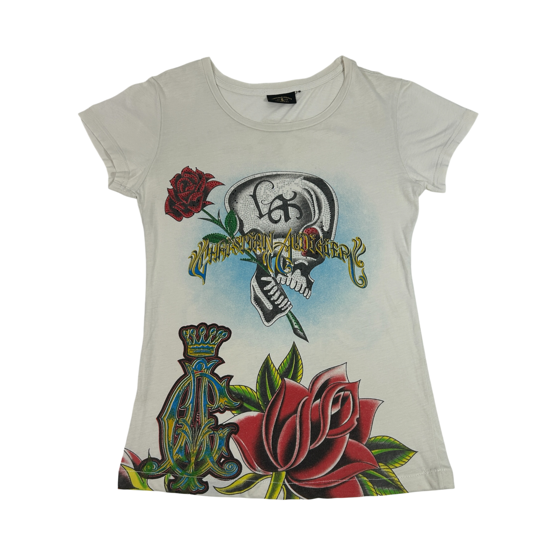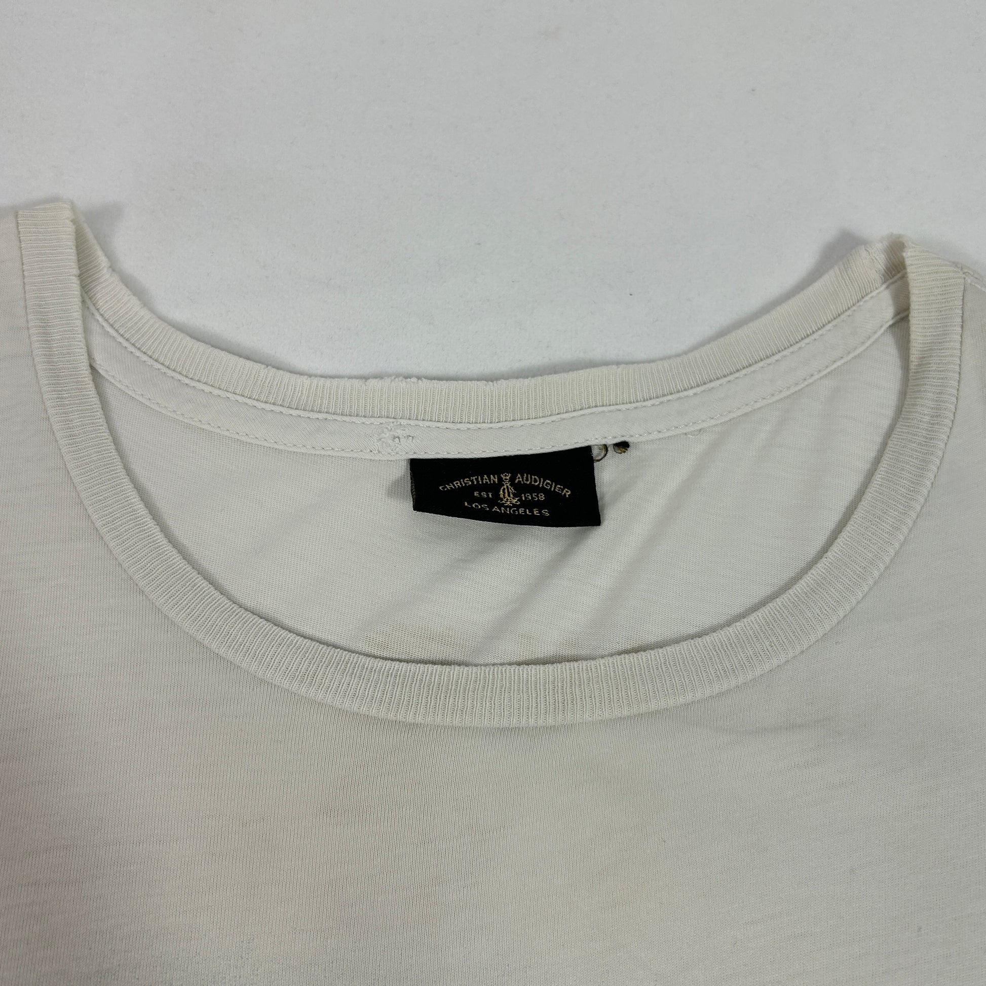 Some staining at the back but super unnoticeable. Collar of top is a tad worn & a small thread pull on right shoulder sleeve. Please refer to pictures.